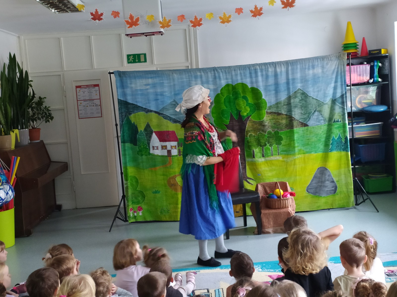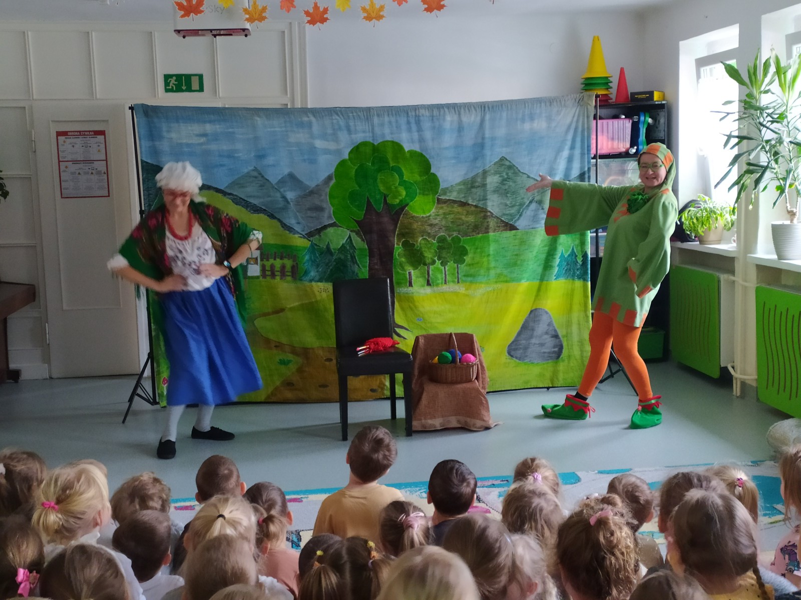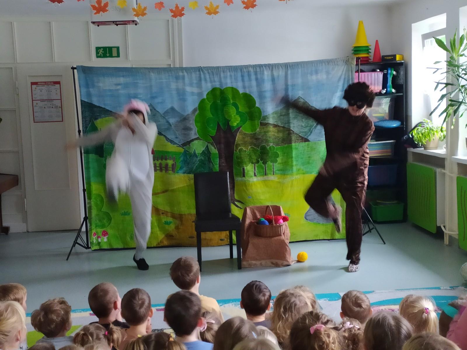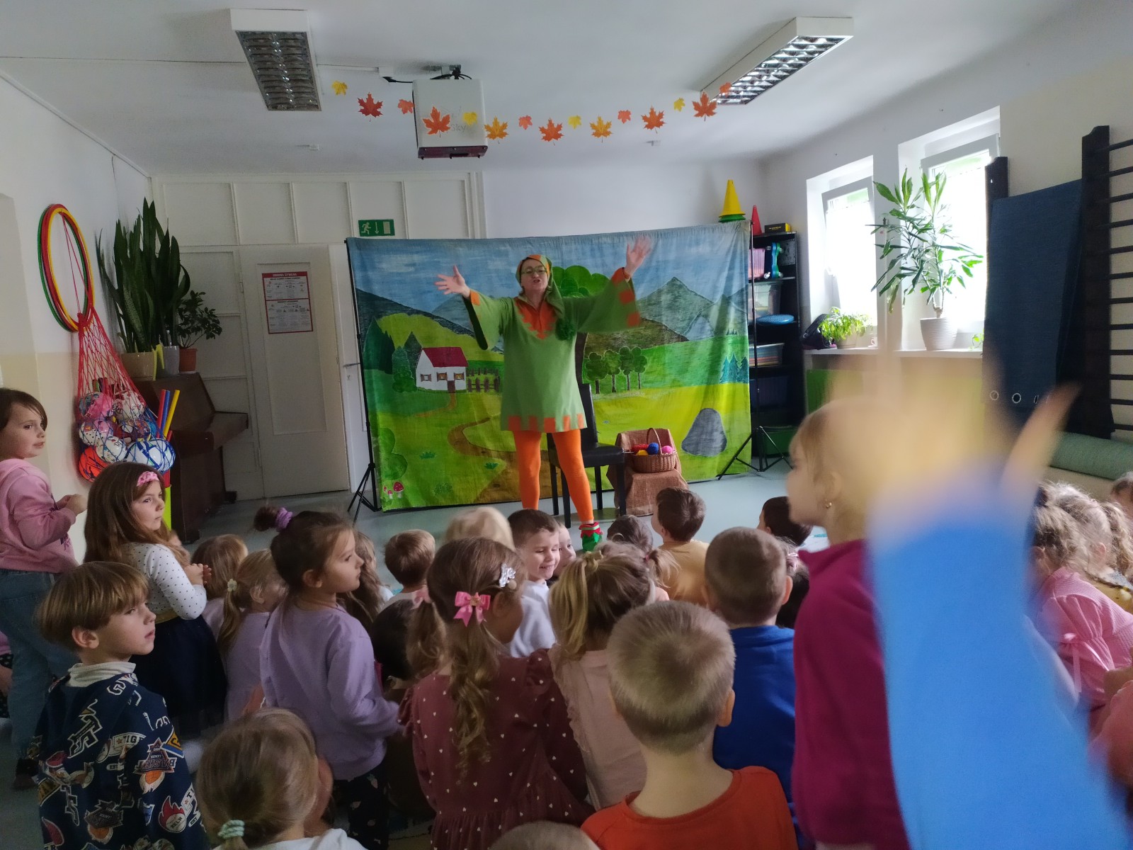27 Listopada 2025Dnia 27 listopada gościliśmy Teatrzyk ,,Skrzat” z Krakowa z przedstawieniem „O babci, krasnalu i kolorowych kulkach”. Była to pełna humoru opowieść o dobrej i uczynnej babci Danucie, Krasnalku z lasu i nie zawsze grzecznym Kotku Psotku oraz kolorowych kulkach, z którymi zrobiło się niezłe zamieszanie. Świadczyły o tym promienne uśmiechy przedszkolaków oraz żywiołowe reakcje na pojawiających się bohaterów i wartką akcję przedstawienia. Jednakże najważniejsze jest to, że bajka uczyła dzieci tego, aby nigdy nie zabierały czegoś, co do nich nie należy.